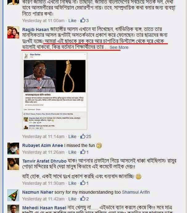 অধ্যাপক ড. জাহাংগীর আলমের সাথে যোগাযোগ করা হলে তিনি জানান, অনেকটা অসচেতনভাবে তিনি কমেন্টটি করছিলেন বলেই পরবর্তীতে তিনি সেটি এডিট করেন। এর পরে তাকে গ্রুপ থেকেও এডমিনরা ব্যান করে দেয়ায় আর কোন উত্তর দেয়ার বা গ্রুপে কি হচ্ছে তা জানার কোন সুযোগ তার ছিল না। গ্রুপটির এডমিনদের স্বেচ্ছাচারীতার কথাও জানান তিনি।
