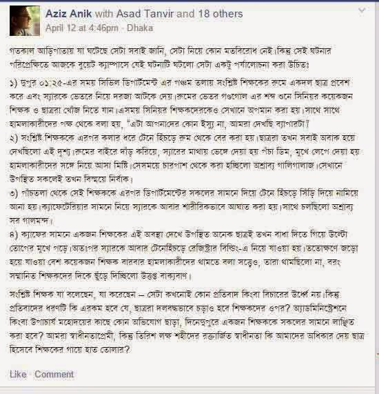 ছবি-৬: শিক্ষকের উপর হামলার বর্ননা দিয়ে সিভিল’০৯ ব্যাচের আজিজ অনিকের ফেসবুক স্ট্যাটাস।