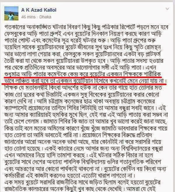 ছবি-১৩: শিক্ষক পেটানোর পিছনে যে গ্রুপের কর্মকান্ড দায়ী তা গ্রুপের মেম্বার এ কে আযাদ কল্লোল (ইলেকট্রিক্যাল’৯১ ব্যাচ) উপলব্ধি করেছেন।