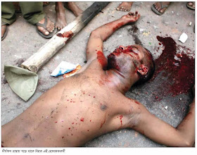 →description:Yesterday has the another black day of Bangladesh history ..In day time on 5th may police killed around 25 protesters in Dhaka while the protesters protest at Motijhil in Dhaka for implementing their 13 points demand.At evening the protesters took decision to stay on street of Motijhil Shapla Square...But at night (2:30 AM) when the protesters were sleeping the joint forces of government killing innocent protesters in street by firing , throwing tear shell ..even they conducted brutality by riot car and demolished the sleeping protesters to kill ..Not only joint forces , some ruling party's activists join to kill unarmed protesters by shot gun and stick .Some media person said joint forces have taken 5 truck of dead body to disappear..Even some journalists said the number of death will be 2500 ...now you will see the some heart broken pictures ..